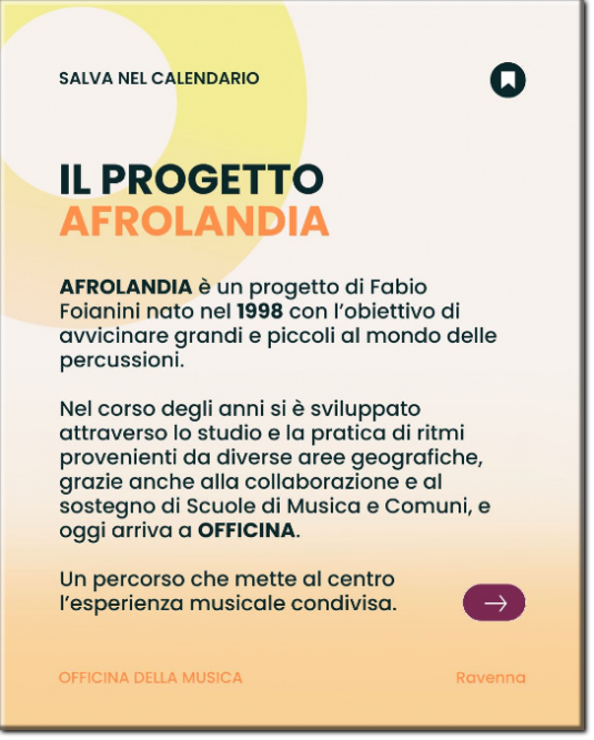 Un percorso collettivo, che esplora Ritmi etnici da tutto il mondo, svilupperà notevolmente l'esperienza musicale dei partecipanti, offrendo loro l'opportunità di scoprire nuovi suoni e stili musicali.